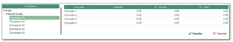 Para ingresar una novedad, en el panel izquierdo se selecciona el estudiante y en el panel derecho se ingresa la cantidad y valor unitario del concepto, seguido se confirma proceso con Guardar o Cancelar.
