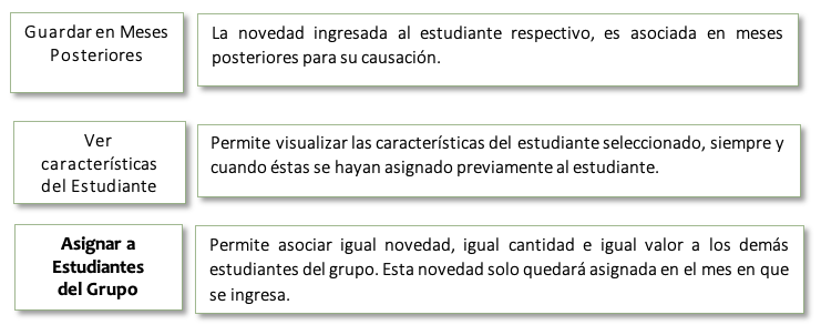 Las novedades hacen referencia a la inclusión de conceptos diferentes o adicionales a los asociados de manera fija y constante en los Conceptos por Estudiante, dichas novedades registran causadas en la misma cuenta de cobro o factura del mes.
