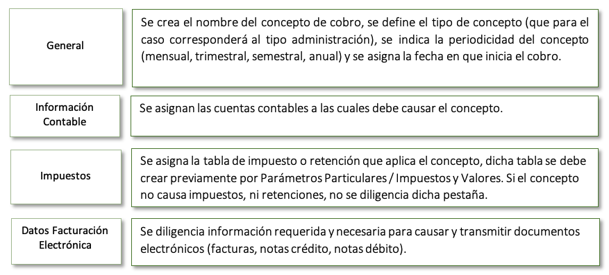 En esta cartilla se crea la lista de conceptos a cobrar/facturar a cada estudiante, diligenciando la información requerida en las siguientes pestañas: