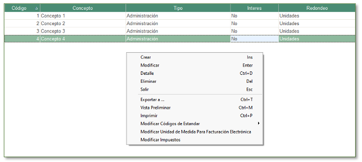 Una vez parametrizados los conceptos, se podrán visualizar en la Cartilla de Conceptos y desde esta cartilla, se podrá hacer uso de las opciones que listan con clic derecho, las cuales permiten crear, modificar, eliminar, exportar a formato excel, pdf o impresora y asignar parámetros de forma masiva para efectos de facturación electrónica.