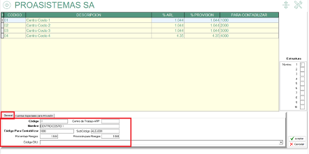 - Porcentaje de previsión de ARL (si en los tipos de nómina se determinó que se va a manejar por centro de costo).