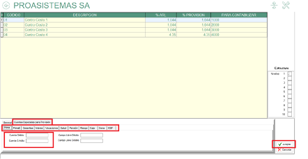 - Definir los campos de las cuentas especiales para provisión, solo se define si la empresa contablemente maneja cuentas para provisión por cada centro de costo de lo contrario se deja en blanco para qué las cuentas que se tomen seas las definidas en los parámetros de provisión del módulo “contabilizar”. Por último, marcar “Aceptar”.