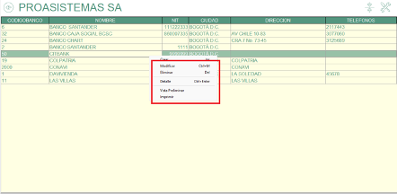 NOTA: Encontramos opciones adicionales que permiten realizar acciones como modificar, eliminar, ver el detalle, guardar e imprimir, estas opciones se listan con “clic derecho”.