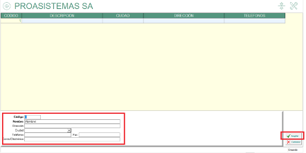 • Definir el código, nombre, dirección, ciudad, teléfono y correo de la sucursal. Por último, marcar la opción “Aceptar”.