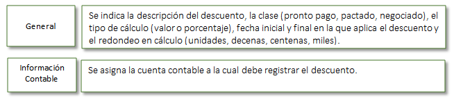 Al parametrizar los descuentos es necesario diligenciar la información requerida en las siguientes pestañas: