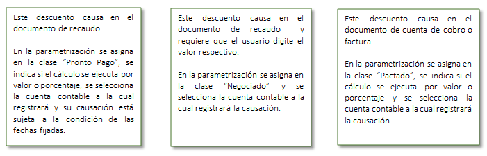 En esta opción se crean y parametrizan los descuentos a causar en los respectivos documentos de cuentas de cobro o factura y en los recaudos.