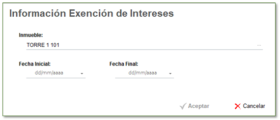 Cuando en la parametrización del concepto se ha marcado que genera intereses de mora y el usuario en el mes de causación de la cuenta de cobro o factura no requiere que el sistema le calcule intereses de mora, es necesario parametrizar en esta opción, la exención de intereses de mora, para que omita dicho cálculo en el inmueble, concepto y periodo indicado.