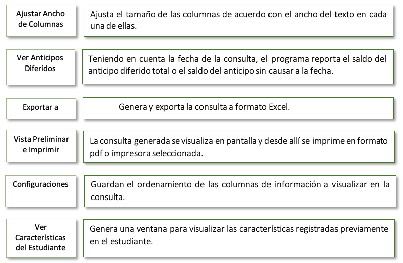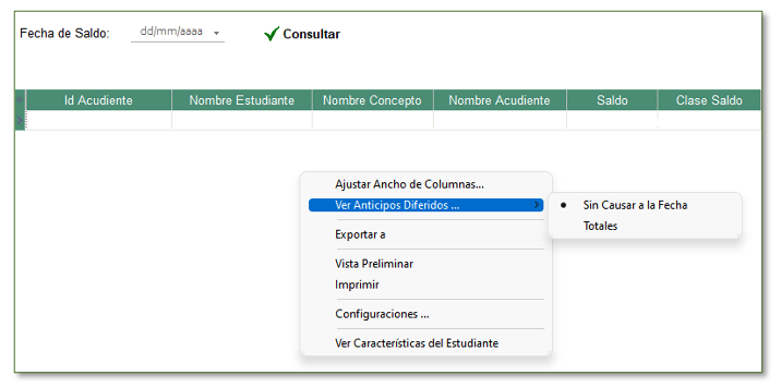 Esta consulta permite visualizar los saldos de los estudiantes a la fecha en que se genera el reporte, detallando valor, concepto y clase de saldo (capital, interés, anticipo).
