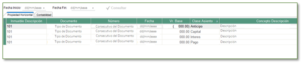 Esta consulta permite visualizar el movimiento de los inmuebles en Propiedad Horizontal y Contabilidad, de acuerdo a la fecha definida al generar la consulta.