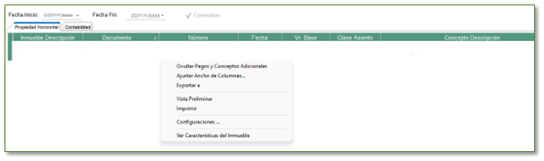 En la consulta de Propiedad Horizontal con clic derecho el programa presenta las siguientes opciones: