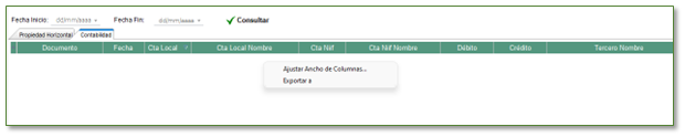 En la consulta de Contabilidad con clic derecho el programa presenta las opciones de Ajustar Ancho de Columnas y Exportar, las cuales cumplen la misma funcionalidad indicada anteriormente.