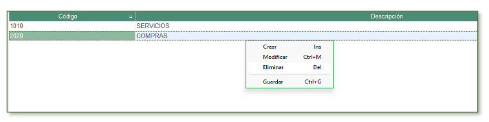 Con la opción Modificar, el programa permite modificar el código si no ha sido utilizado en procesos de causación, de lo contrario solo permite modificar la descripción.