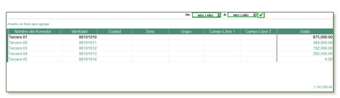- También lista ciudad, zona, grupo y campos libres que reportan la información ingresada en la Cartilla de Acreedores.