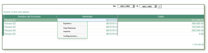 Con clic derecho se puede exportar la consulta a formatos XLS, TXT, HTML, ver en pantalla, imprimir en PDF o impresora seleccionada y guardar la configuración de las columnas a visualizar en la consulta.