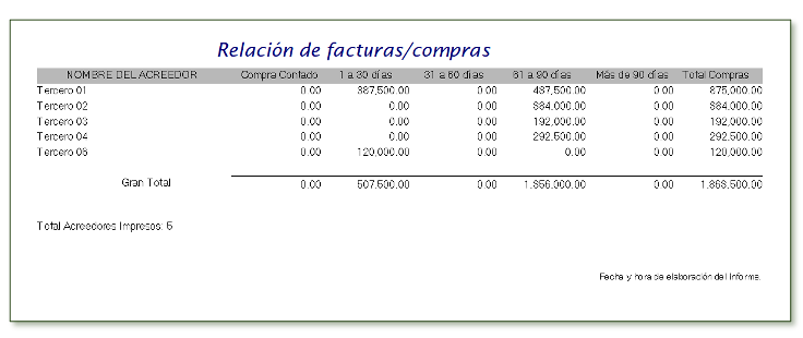 El informe reporta el total de facturas o compras realizadas, de acuerdo con la fecha inicial y final indicada, reporta por cada proveedor y acreedor compras de contado y crédito 30, 60 y 90 días, permite detallar la cuenta contable y seleccionar cuentas específicas del pasivo para generar el informe de acuerdo con los criterios establecidos.