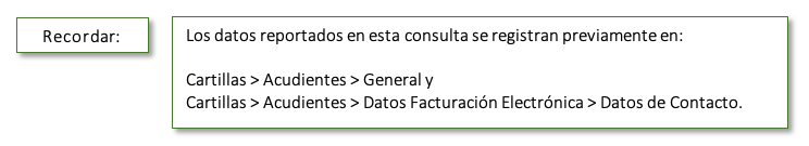 Esta opción genera una consulta con el número de identidad, nombre, dirección, teléfono, ciudad, registrados en la cartilla de acudientes en la pestaña datos generales.