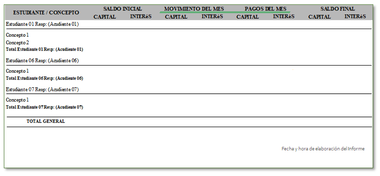 Este informe reporta saldos por concepto, especificando saldo inicial – movimiento del mes – pagos del mes – saldo final, de acuerdo a la fecha definida en el informe.