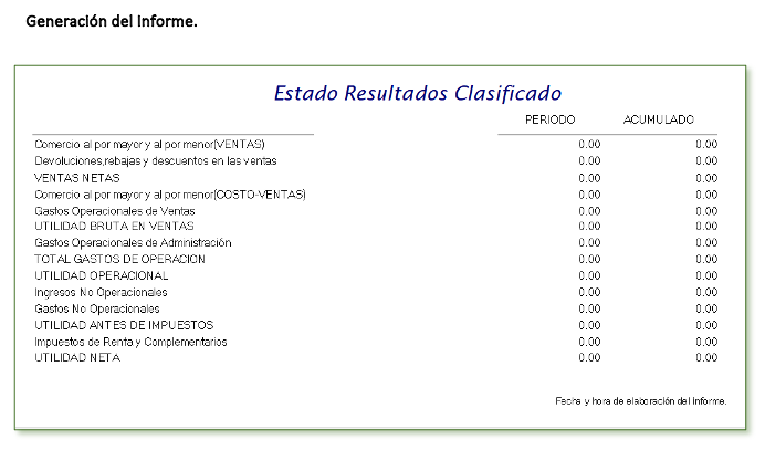 Este reporte tiene la particularidad de ser parametrizable en su estructura y asociación de cuentas para generar el Estado de Resultados del mes y acumulado.
