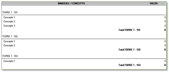 Los parámetros de generación del informe permiten listar por inmueble o concepto.