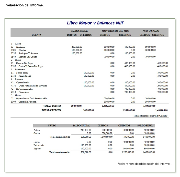 Reporta saldo inicial, movimiento débito, crédito y nuevo saldo de registros en norma internacional, de acuerdo con el periodo seleccionado al generar el informe.