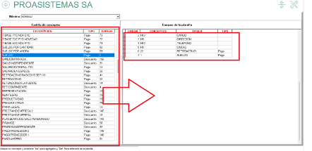 - Arrastrar hacia la derecha con el mouse los conceptos que se manejan en la nómina seleccionada en el punto anterior, en el orden que se requieren. Se pueden agregar conceptos tipo texto para relacionar datos básicos de los empleados como, por ejemplo, cargo, dirección, teléfono, ciudad, etc.