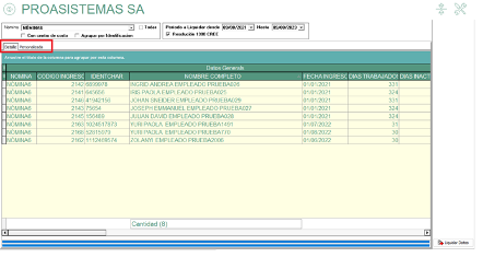 - Definir si la consulta se quiere generar con centro de costo y si se quiere agrupar por identificación. Por último, marcar la opción “liquidar datos”.