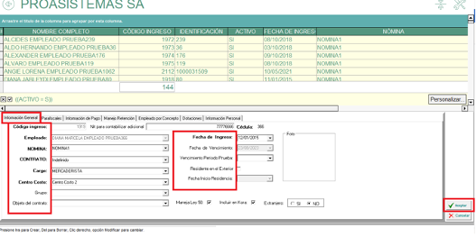 En esta opción se definen las condiciones laborales con las que se contrata a un empleado. En esta opción se lista de personas creadas previo, en las hojas de vida, se deben crear en hojas de vida para poder asignar las condiciones laborales y salariales en esta opción.