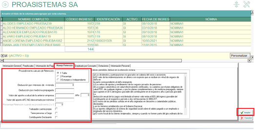 - Manejo de retención: Se debe definir el procedimiento a aplicar y las deducciones que tiene cada empleado para el cálculo de retención en la fuente como: