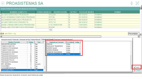 - Empleado por concepto: Deben aparecer los conceptos asociados en los tipos de nómina, únicamente los que el programa calcula de manera automática (sueldo, auxilio de transporte, aporte a salud, aporte a pensión, rete fuente y fondo de solidaridad) como se muestra en la imagen, los demás pagos y descuentos se deben ingresar por las opciones correspondientes.