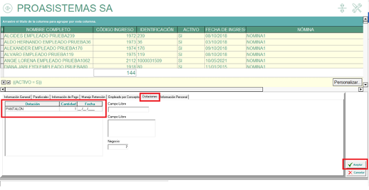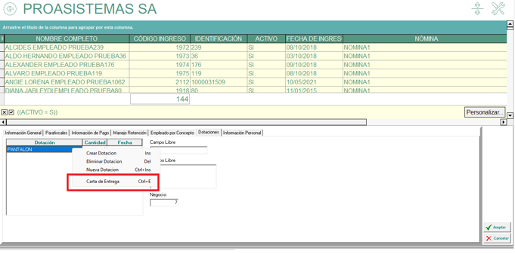 NOTA: después de registrada la dotación se puede generar una carta de entrega con clic derecho, para ser enviada vía correo electrónico al empleado o ser impresa de manera física. Al correo registrado en la hoja de vida de cada empleado, llegara la carta. Este proceso se debe hacer empleado por empleado.