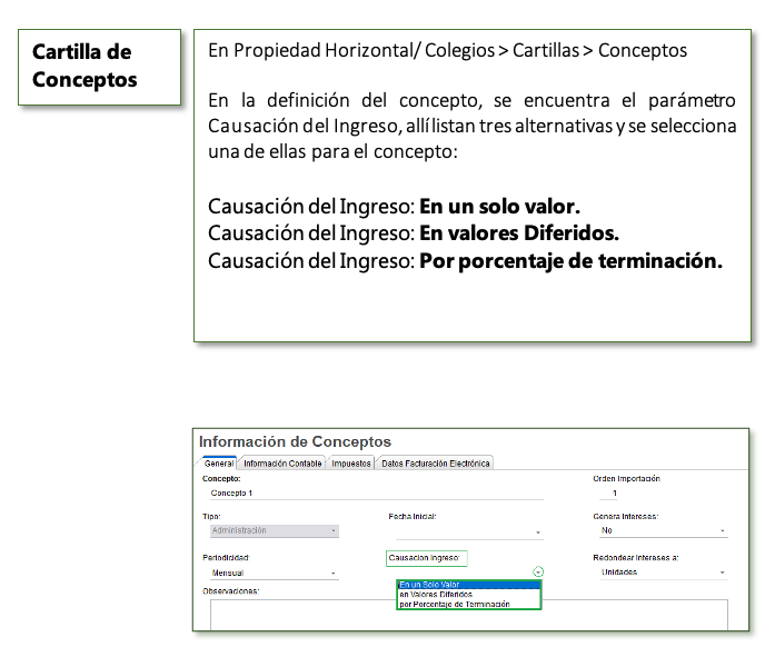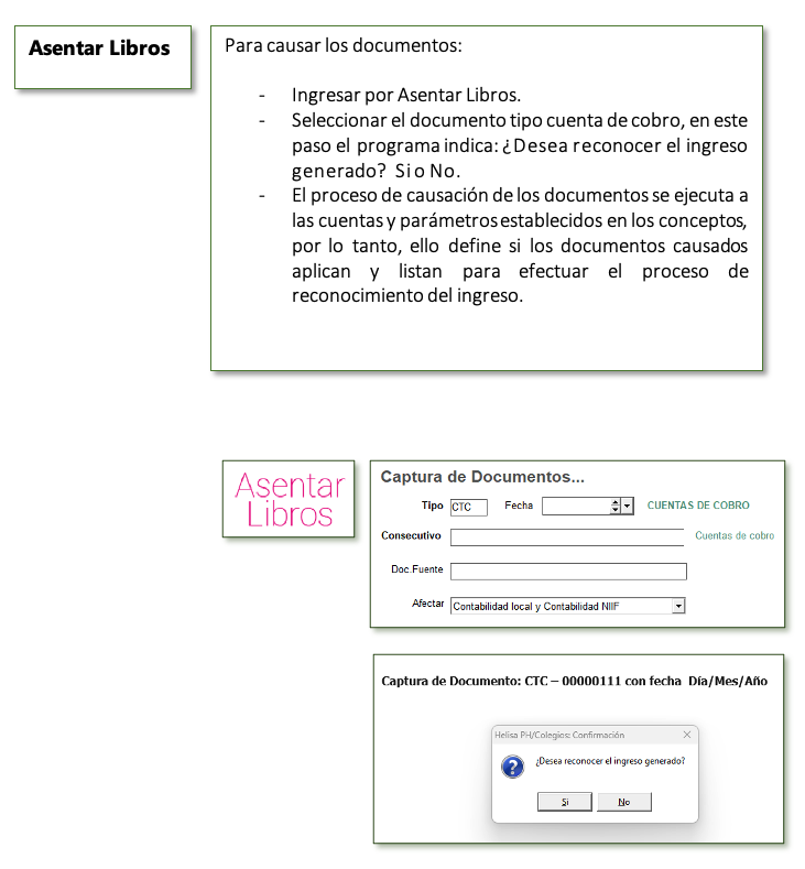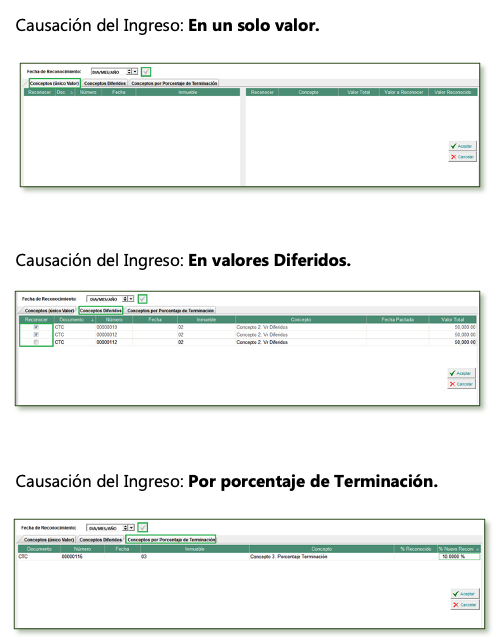 Al ejecutar el proceso de reconocimiento de ingreso, el programa adiciona internamente un registro contable en el documento tipo cuenta de cobro causado originalmente, en el registro contable lleva el valor calculado del reconocimiento del ingreso según la parametrización de los conceptos de Propiedad Horizontal /Colegios y dichos valores causan en las cuentas contables del ingreso definidas en la cartilla de conceptos de Propiedad Horizontal/ Colegios.