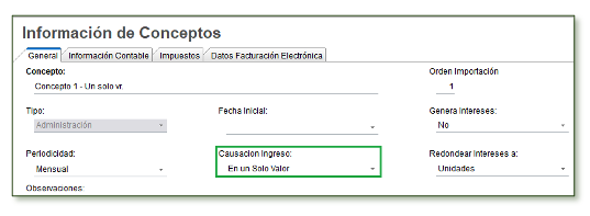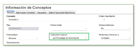 Con este parámetro, al momento de efectuar el reconocimiento del ingreso se asigna el porcentaje a aplicar para que el programa cause el valor correspondiente como reconocimiento de ingreso.
