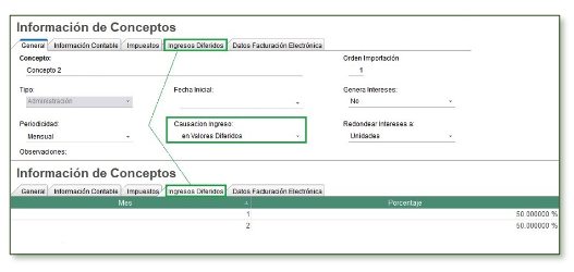 Cuando se asigna este parámetro al concepto, se activa una pestaña para insertar los meses y porcentajes a aplicar en el momento de ejecutar el reconocimiento del ingreso.