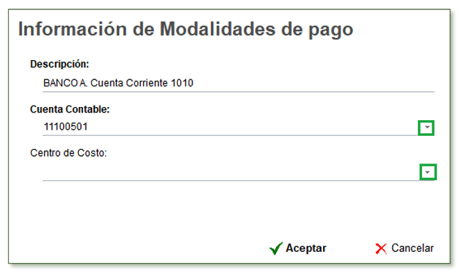 Al ingresar a la opción con clic derecho Crear, se activa la ventana para definir la información de cada Modalidad de Pago con los siguientes datos: Descripción, cuenta contable y centro de costos.