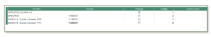 - Centro de Costos. Si el usuario requiere asignar un centro de costo para cada modalidad de Pago, de la lista se selecciona el centro de costos, si no requiere asociar, no se asigna.