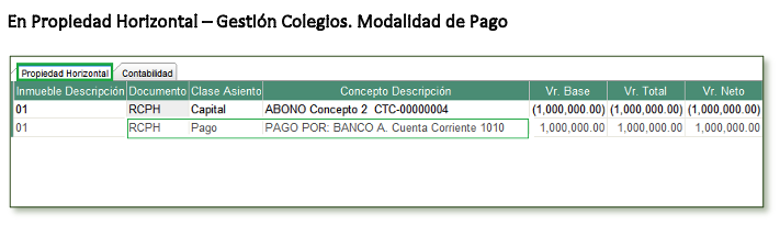 De este modo a nivel de Propiedad Horizontal, Gestión Colegios el programa registra a la Modalidad de Pago seleccionada y en Contabilidad registra a la cuenta contable asociada en la Modalidad de Pago.