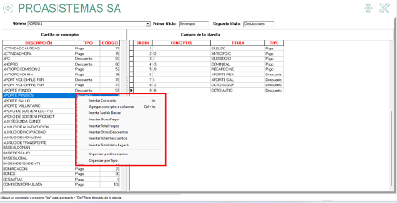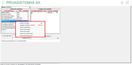• Con clic derecho sobre la “cartilla de conceptos” se habilitan varias opción y campos que se pueden agregar a la planilla.