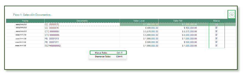 - Se puede realizar la selección marcando un solo documento o con clic derecho se activa la opción Marcar Todos o Ctrl + T.