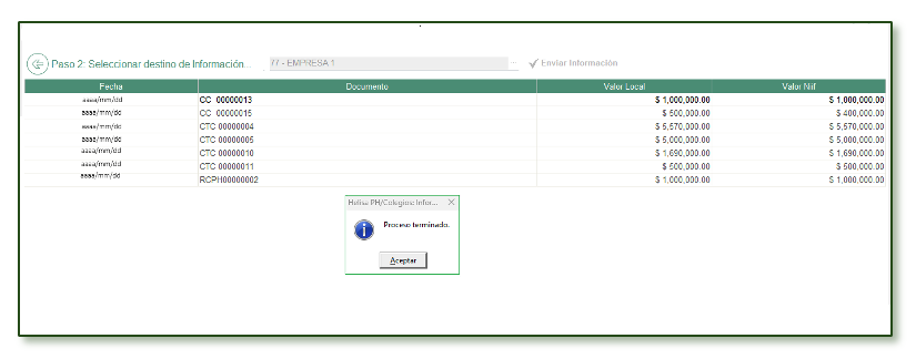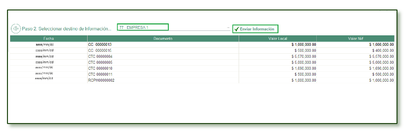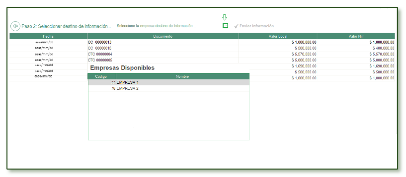 - Al realizar lo indicado, en el campo Seleccione la empresa destino de Información, ahora reporta el código y nombre de la empresa seleccionada y se activa el botón Enviar Información.
