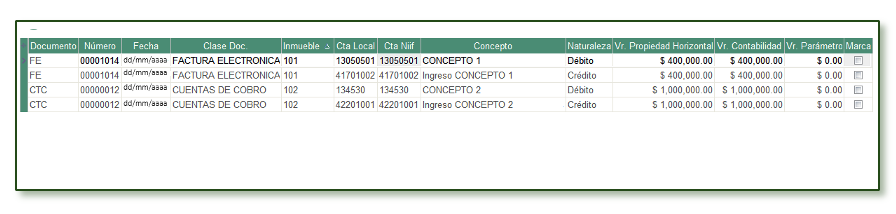 - Marca. Permite seleccionar los documentos que reportan diferencias o valores en la columna Vr. Parámetro con el fin de ejecutar la redefinición del registro contable con la cuenta actual asociada el concepto.