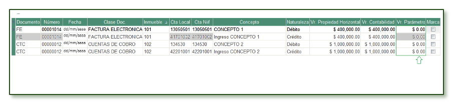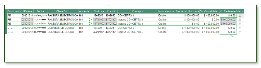 - Si las cuentas de los conceptos fueron modificadas posterior a la captura de los documentos se confirma cuando el valor se refleja en la columna Vr. Parámetro como diferencia en el documento.