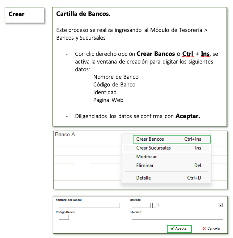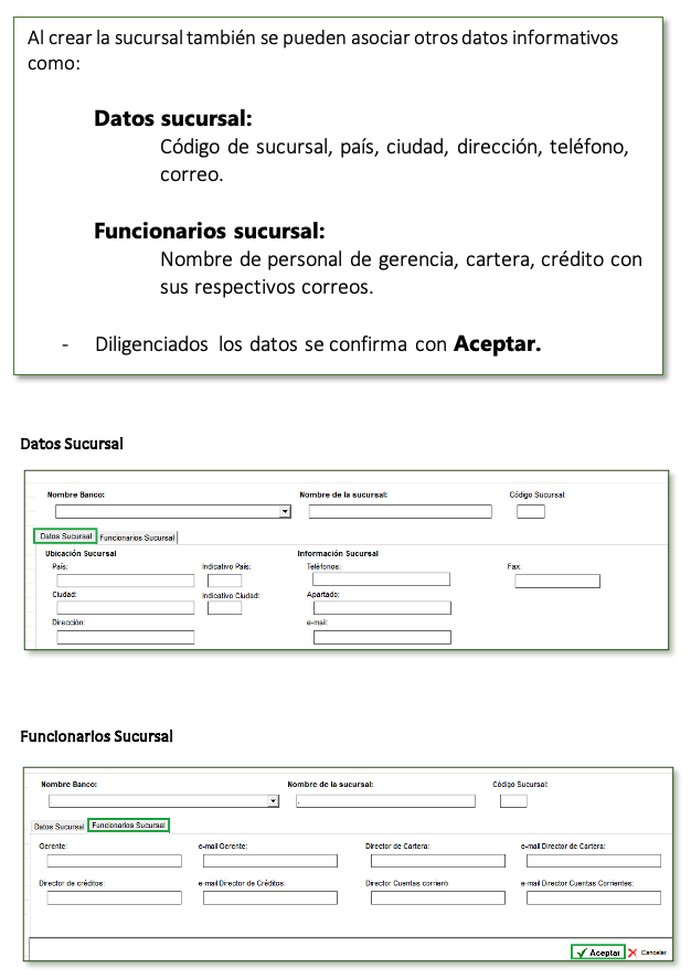 - Modificar: Datos informativos digitados en los bancos y sucursales.