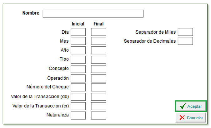 Permite estructurar la parametrización del formato del extracto bancario a importar.