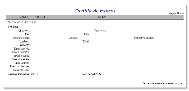 Esta cartilla reúne datos informativos del banco: Nombre del banco, NIT del banco, nombre sucursal, dirección del banco, nombre y correos electrónicos de personas a contactar en el banco, ciudad, teléfonos.