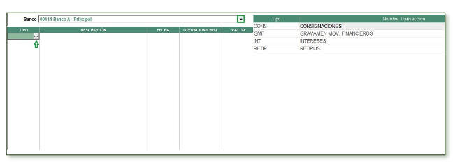 • Tipo: Corresponde a los conceptos de Operaciones para Medios (Extracto Bancario). Al pulsar clic se visualiza la cartilla de conceptos, se selecciona el correspondiente y se continúa llenado la información en las siguientes columnas.