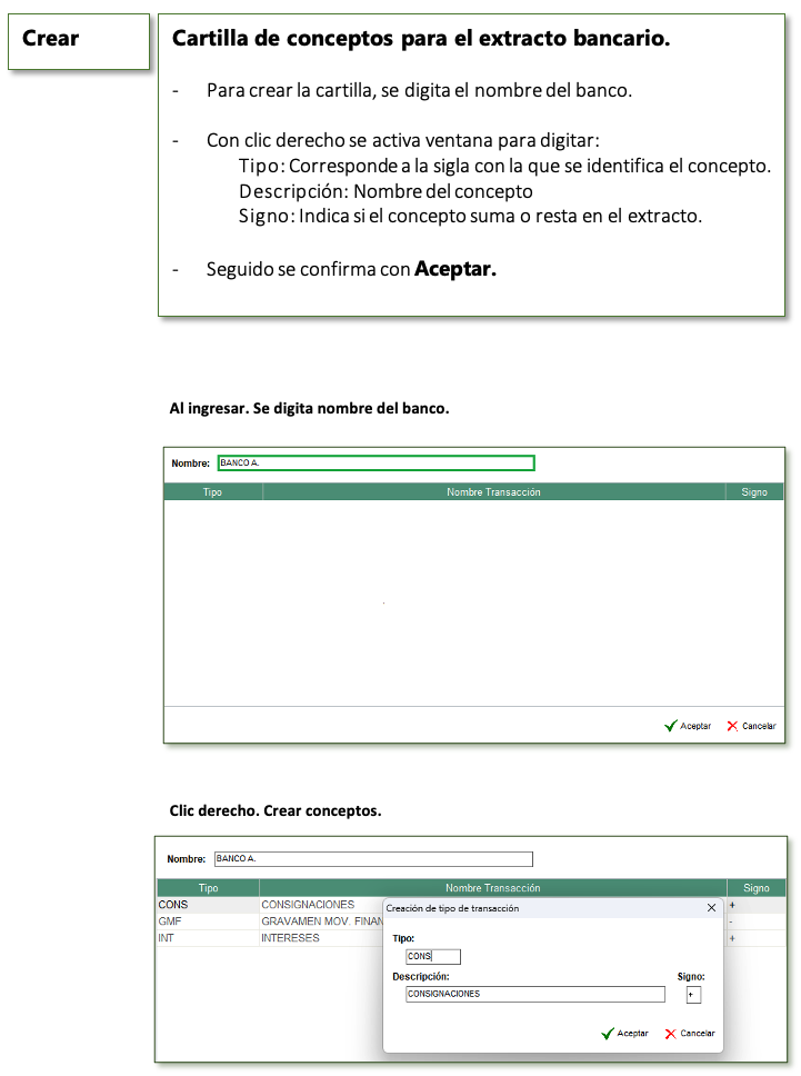 • Crear: Conceptos para el extracto bancario.