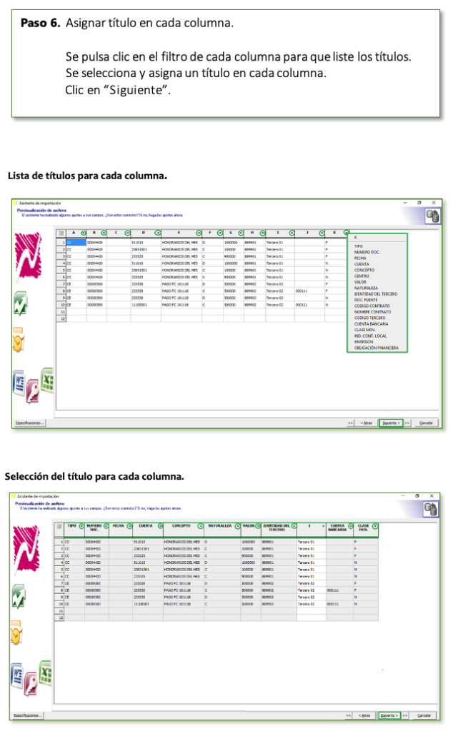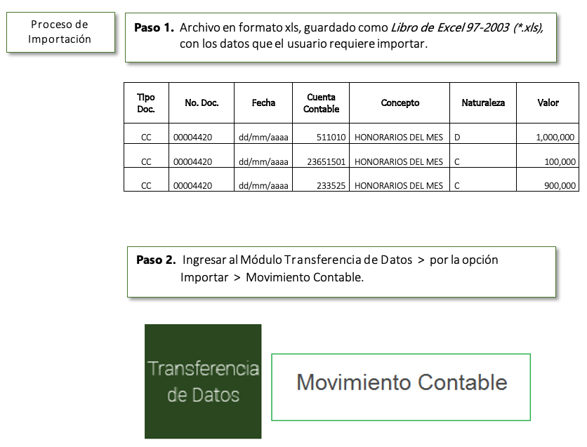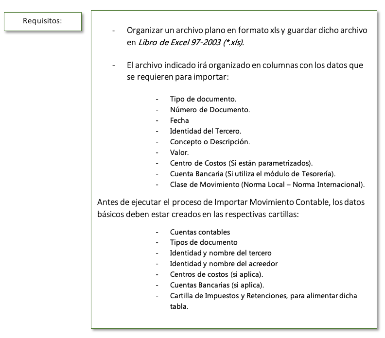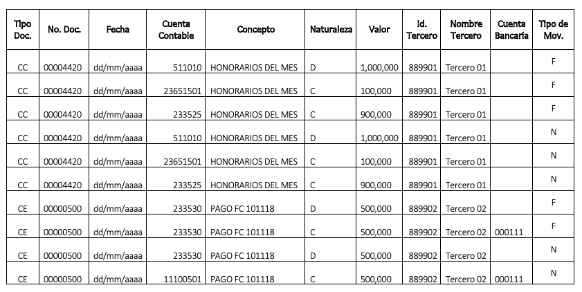 A continuación, ejemplo del archivo en Excel para Importar Movimiento Contable.