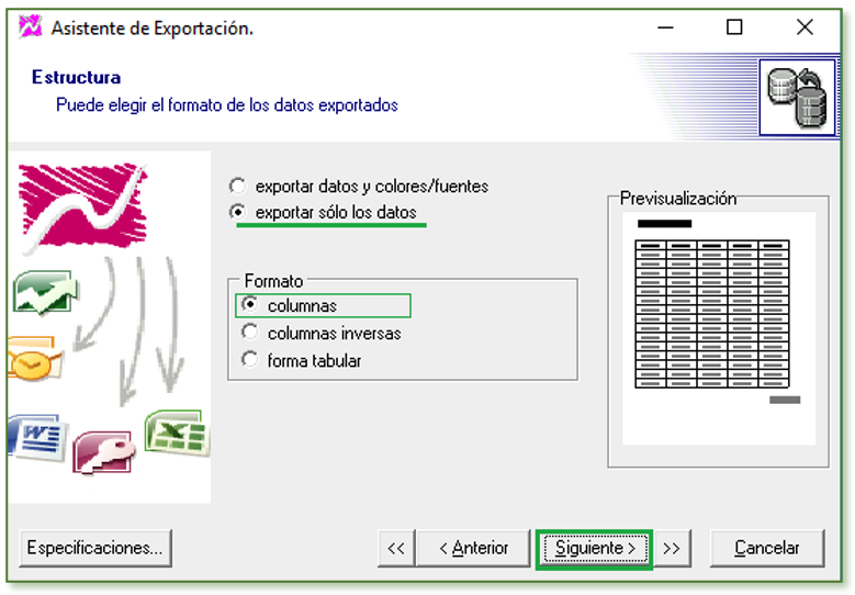 Paso 6: Exportar la información en formato columnas. Clic en “Siguiente”.