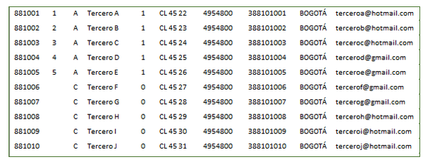 | 881003 | 3 | A | Acreedor C | 1 | CL 45 24 | 4954800 | 3881010101 | BOGOTÁ | 2 | acreedor@gmail.com |