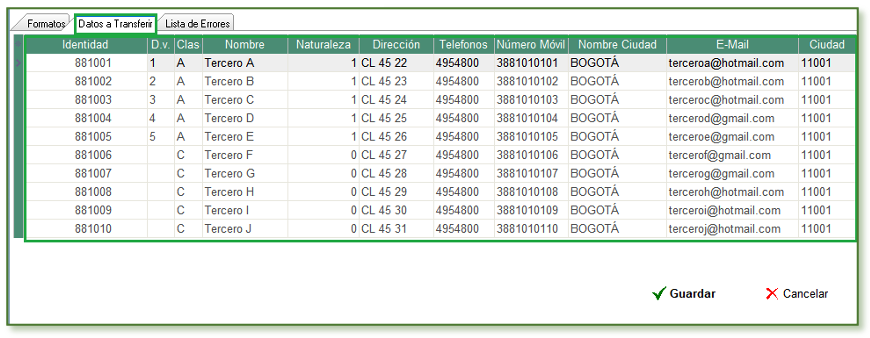| 881002 | 2 | A | Acreedor B | 1 | CL 45 23 | 4954800 | 3881010101 | BOGOTÁ | 1 | acreedor@gmail.com |